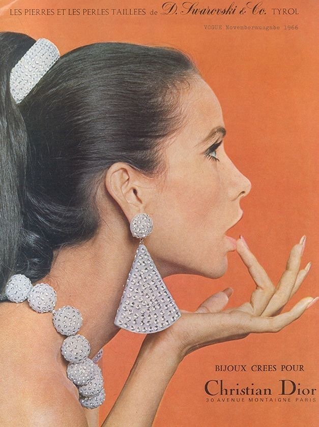 Во-вторых, главный ювелир Dior начал создавать оптические со странами Swarovski: Роже Жан-Пьер тесно сотрудничал с компанией Swarovski. В 1960-х он использовал специально ограненные камни и эффект Aurora Borealis (“северное сияние”), создавая украшения, которые меняли цвет в зависимости от освещения — это было настоящим технологическим прорывом для того времени.