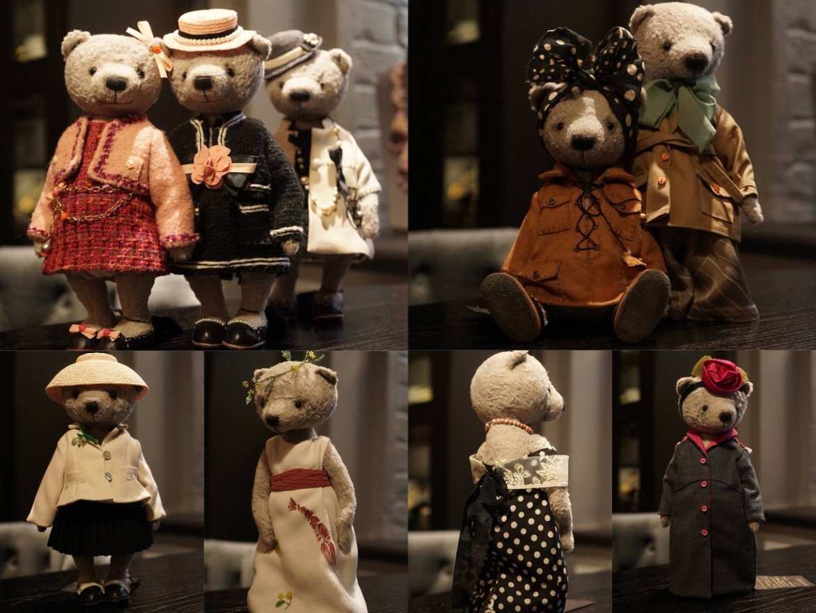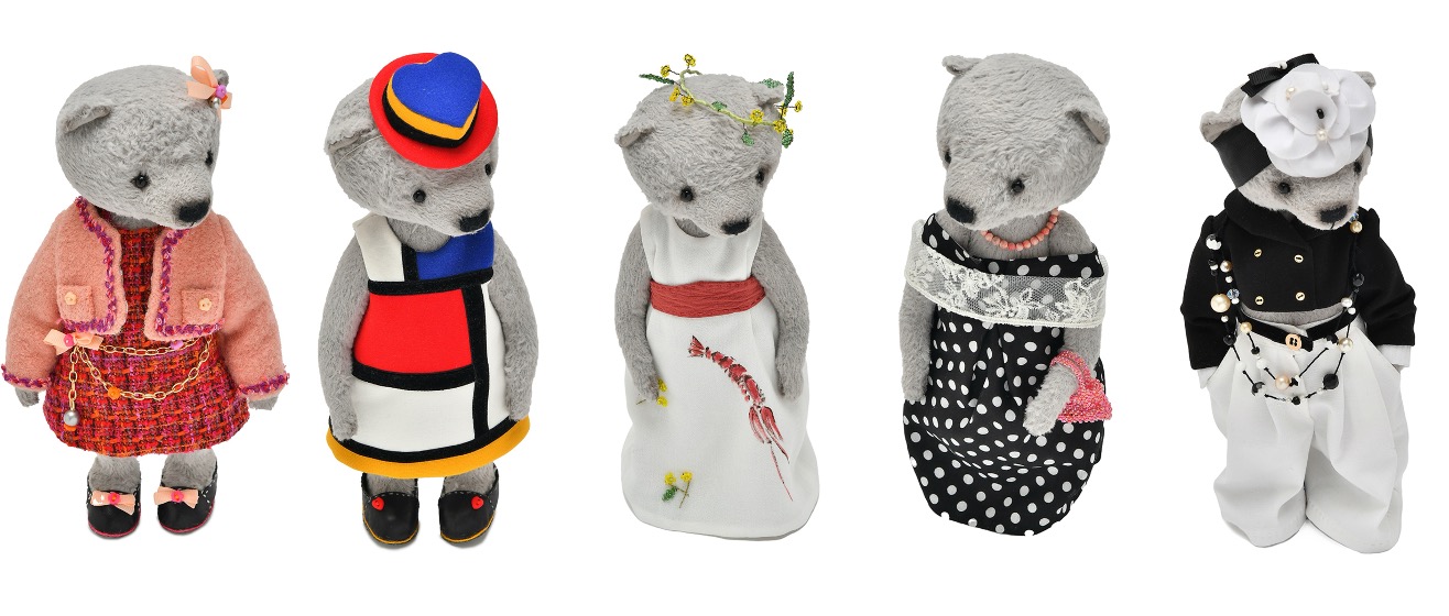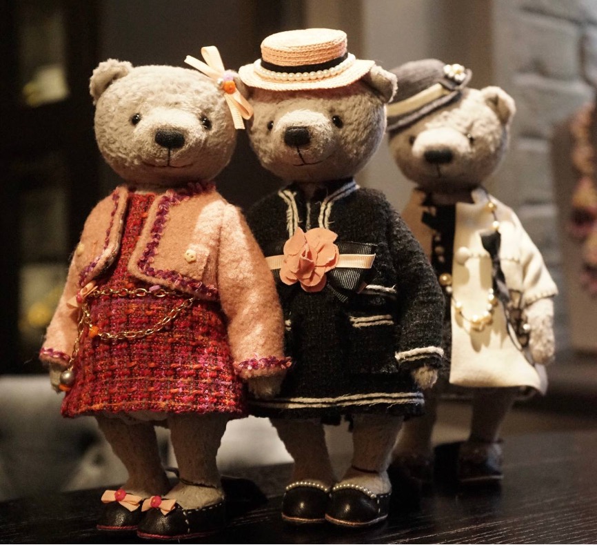 Одежда, обувь и аксессуары выполнены в классических стилях модного дома Шанель с использованием твида и жемчуга, отражают элегантность и утонченность, присущие бренду. Мишки дополнены миниатюрными сумками и украшениями, каждый образ сформирован на основе культовых коллекций и образов дома Chanel XX века.