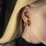 Эти винтажные клипсы Dolce Vita — маленькое украшение с большим настроением. Выразительная форма, золотистый металл и насыщенные алые вставки создают тот самый эффект украшения, которое мгновенно собирает образ. Абстрактная композиция из переплетающихся линий и кабошонов в рубиново-красных оттенках выглядит очень по-модному: будто винтажная итальянская бижутерия встретилась с современной скульптурной эстетикой. Клипсы компактные, но при этом заметные — идеальный акцент для базового гардероба, жакета, шелковой блузы или вечернего образа.
