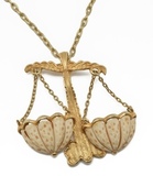 Это винтажное колье от Razza — редкое и очень выразительное украшение с декоративным мотивом весов, выполненное в характерной для бренда театральной и символичной эстетике. Подвеска выполнена из металла золотого тона и дополнена объёмными чашами, стилизованными под резную слоновую кость. Фактура и оттенок вставок создают эффект старинной резьбы, придавая украшению особую коллекционную привлекательность. Именно такие детали сделали украшения Razza узнаваемыми: бренд любил работать с образами, символами и скульптурными формами, превращая бижутерию в маленькие арт-объекты. Мотив весов считывается сразу как образ баланса, внутренней силы и тонкого вкуса — поэтому украшение выглядит не просто эффектно, а по-настоящему содержательно. Оно легко становится центральным акцентом образа и не требует дополнительных украшений. Марка Razza особенно ценится коллекционерами за фигуративные и символические украшения, а пик популярности бренда пришёлся на 1960–1970-е годы. Сегодня такие изделия особенно интересны тем, кто ищет винтаж с историей, характером и необычным художественным решением.